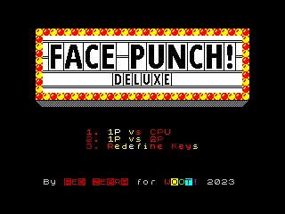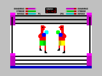 It's an enhanced machine code rewrite of a C.S.S.C.G.C entry, with two player versus mode and several different joysticks supported. It adds a few "strategic" elements, like stamina and defense meters that refill over time.